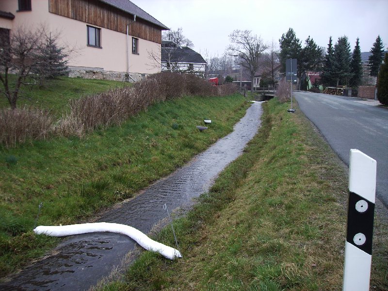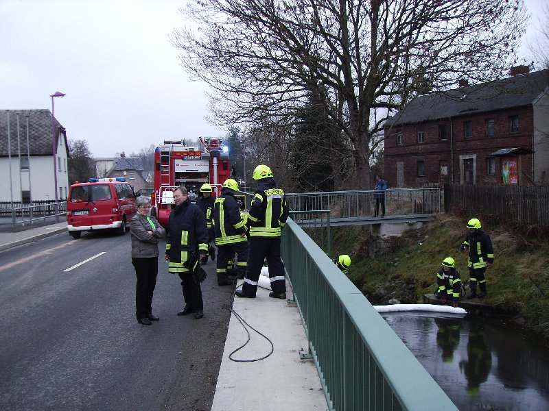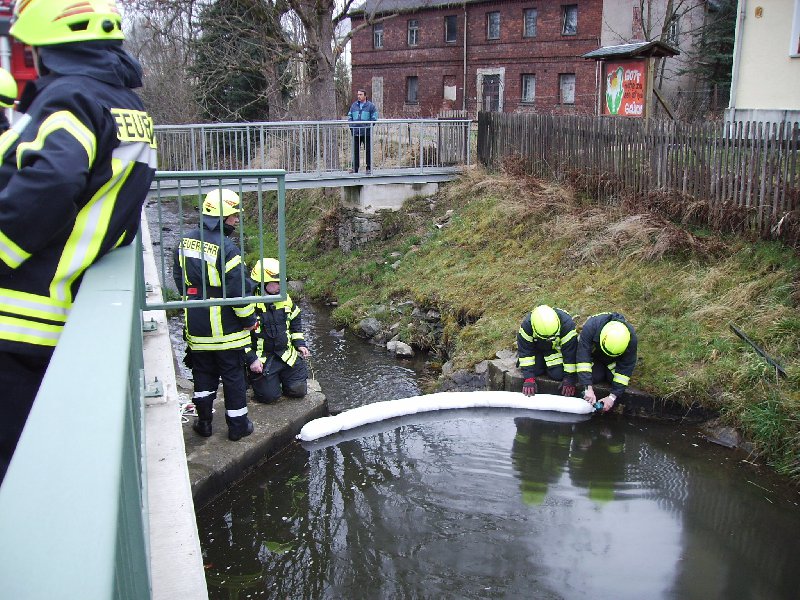 Am 25.03.2014 um kurz nach 9:04 Uhr wurden wir gemeinsam mit den Feuerwehren Triebel, Sachsgrün und Posseck von der Leitstelle Plauen alarmiert. Beim Betanken von Heizöl war ein Hausanschlussflansch gebrochen und eine unbekannte Menge in die Umgebung gelaufen. Unsere Aufgabe bestand im auslegen und anbringen von Ölsperren und Ölbinder. Im weiteren Verlauf kam der Ölskimmer der Feuerwehr Falkenstein zum Einsatz, welcher mit unserer Drehleiter zu Wasser gebracht wurde.
