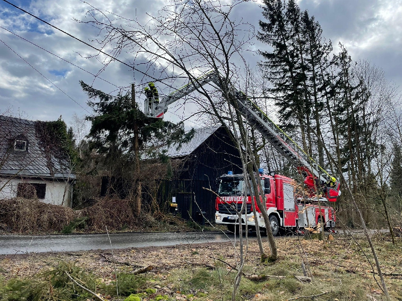 Im Laufe des späteren Vormittags bis in die Nachmittagsstunden wurden im Anschluss noch Masten gesichert bzw. Bäume beseitigt, welche in Masten bzw. Freileitungen hingen oder auf Wege/Straßen zu fallen drohten. Gerade für diese Einsätze erwies sich das Gelenk des Leiterparks der neuen Drehleiter als sehr hilfreiche Technik.