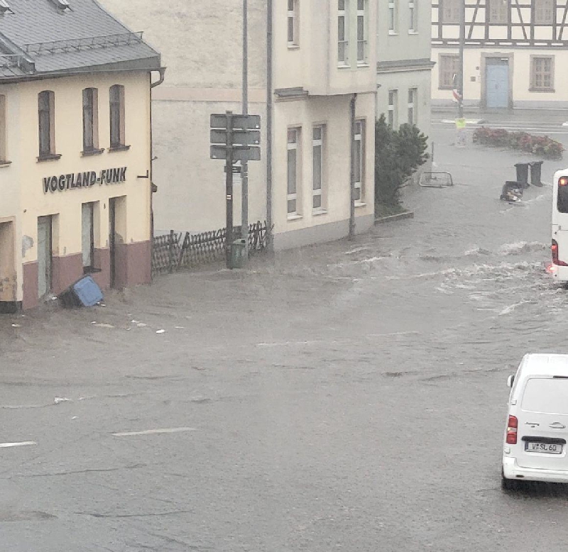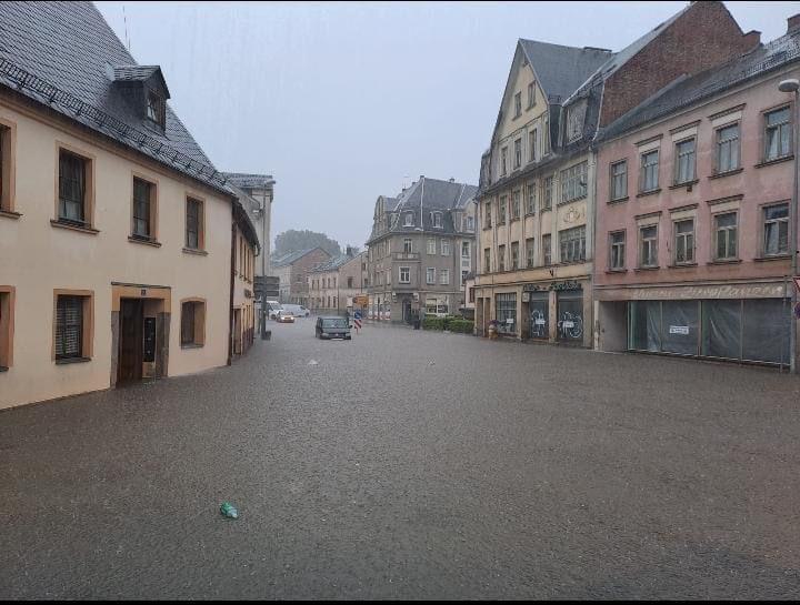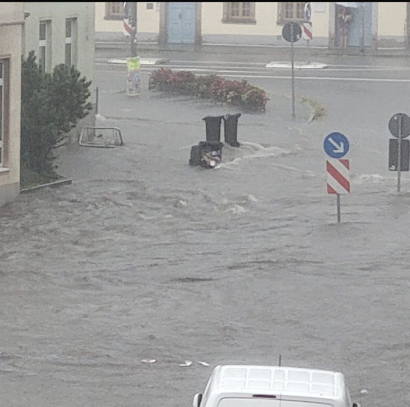 Aufgrund von äußerst ergiebigen Regenfällen innerhalb kürzester Zeit kam es am Donnerstag zu insgesamt 23 Einsätzen im Oelsnitzer Stadtgebiet. Der größte Teil der Einsätze betraf Keller, die unter Wasser standen sowie überflutete Straßen. Besonders betroffen waren die Bereiche Heppeplatz, Am Jahnteich und die untere August-Bebel-Straße. In den meisten Fällen der vollgelaufenen Keller mussten wir jedoch nicht eingreifen, da keine besondere Gefahr für größere Sachwerte oder Leib und Leben bestand.