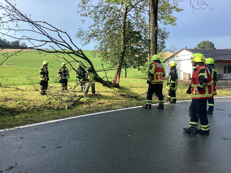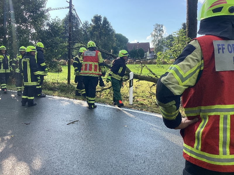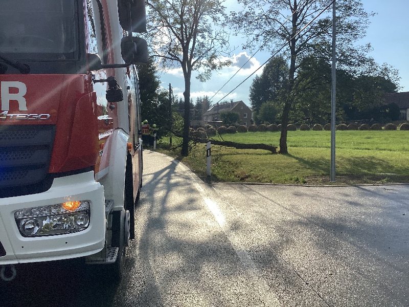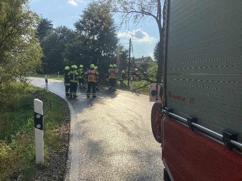 Auf Grund eines kurzen Sturmes brach ein großer Teil eines Baumes ab und hing in der Stromfreileitung. Wir beseitigten die Gefahr mit der Kettensäge und ließen den Energieversorger über die Leitstelle informieren.