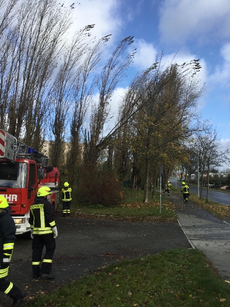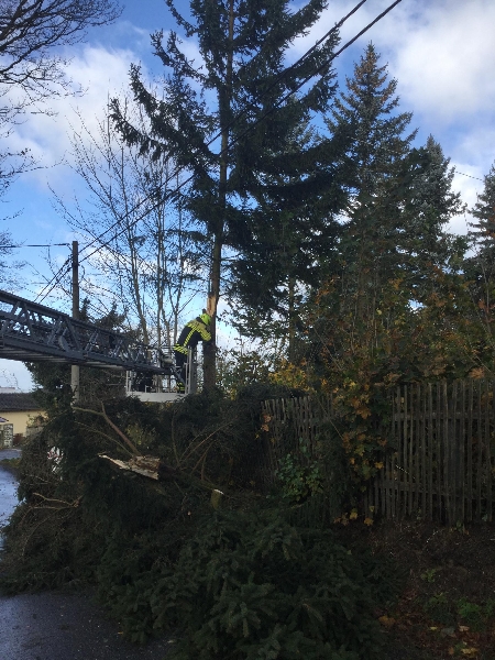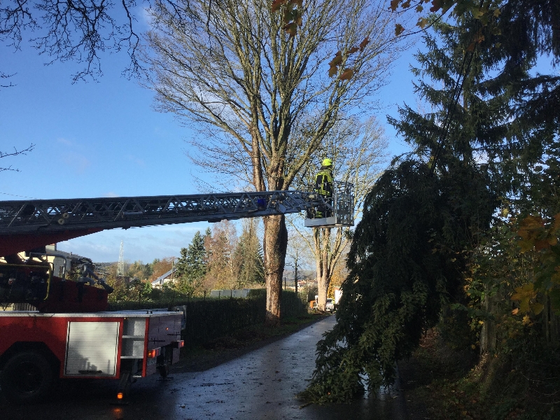 Der erste Einsatz an diesem stürmischen Sonntag begann an der Schönecker Straße, hier brach eine Baumspitze ab und verfing sich in einer Stromleitung.