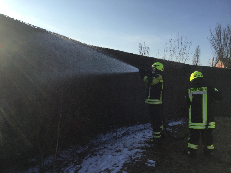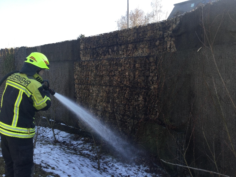 Das Schutzgewebe an der Schallschutzmauer brannte auf ca. 25m². Der Brand konnte mittels Schnellangriff zeitnah unter Kontrolle gebracht und gelöscht werden.