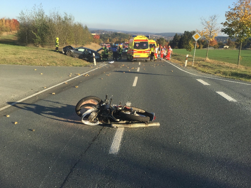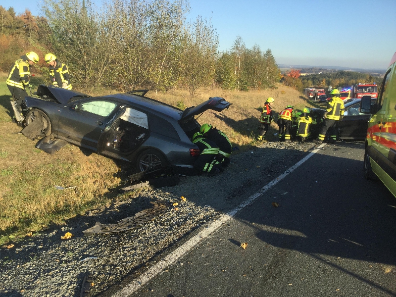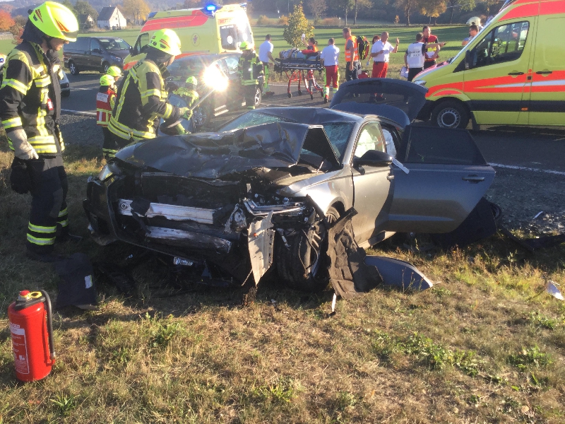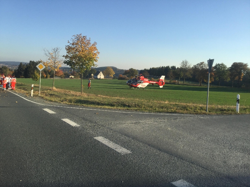 Zu einem Großaufgebot an Feuerwehr und Rettungsdienst kam es am Samstagnachmittag. Alarmiert wurden die Einsatzkräfte zu einem schweren Verkehrsunfall mit mehreren Fahrzeugen und mehreren Verletzten. Die erste Lagemeldung durch den IBL bestätigt dies, wonach 2 PKWs und ein Motorrad verunfallt waren und mindestens 5 Personen schwer verletzt sind. Entgegen der Alarmierung waren keine Personen eingeklemmt und somit konnten alle Personen zeitnah durch die umfangreichen Rettungsdienstkräfte versorgt werden, leider verstarb der Motorradfahrer noch an der Einsatzstelle. Die Feuerwehrkräfte sperrten die Einsatzstelle weiträumig ab, sicherten die auslaufenden Betriebsmittel und machten die Fahrzeuge stromlos.