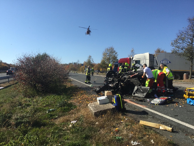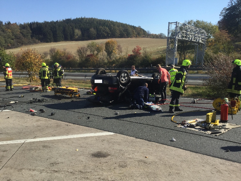 Mit der Meldung „brennender Pkw nach VU“ wurden die Einsatzkräfte der FF Weischlitz und der Wache Oelsnitz auf die A 72 in Richtung Hof geschickt. Nachdem die alarmierten Feuerwehrfahrzeuge nahezu gleichzeitig an der Einsatzstelle ankamen, bot sich ein Bild der Verwüstung. Ein Pkw war aus bisher ungeklärter Ursache mit hoher Geschwindigkeit gegen den Bordstein einer Rasenfläche gefahren. Dabei wurde er nach oben geschleudert, prallte in die Fahrerseite eines parkenden Lkw und kam auf dem Dach zum Liegen. Gemeinsam mit den Kameraden aus Weischlitz befreiten wir eine eingeklemmte Person, unterstützten den Rettungsdienst beim Transport einer weiteren verletzten Person, verhinderten die Ausbreitung der ausgelaufenen Betriebsmittel und stellten den Brandschutz an der Einsatzstelle sicher.