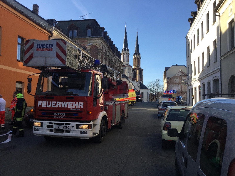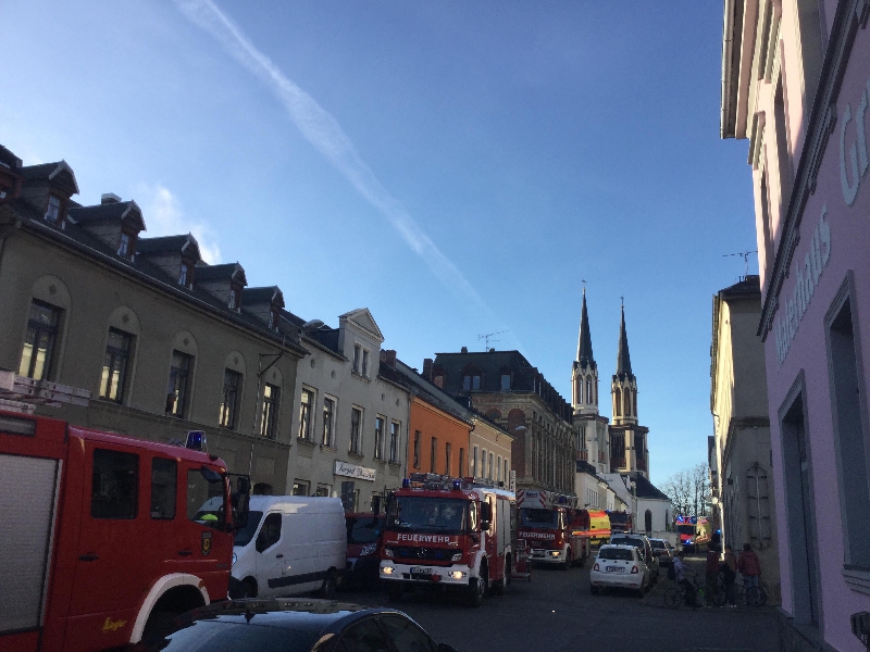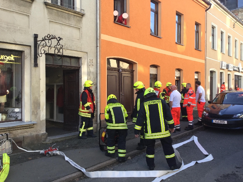 Ein überfüllter Aschekasten eines Ofens zusammen mit der starken Sonneneinstrahlung auf den Schornstein führten zu einer starken Verrauchung eines Ladens, des Kellers sowie des Treppenhauses. Für die Außenstehenden sah es nach einem vermutlichen Kellerbrand aus, zu dem die Leitstelle Zwickau die Feuerwehr Oelsnitz alarmierte. An der Einsatzstelle eingetroffen gingen mehrere Gruppenführer zur gemeinsamen Lageerkundung vor. Die Bewohnerin konnte schnell ins Freie gebracht und an den Rettungsdienst übergeben werden, glücklicherweise gab es keine Verletzungen. Da der Keller relativ stark verraucht war ging ein Trupp unter Atemschutz vor, erkundet den Keller vollständig mit Wärmebildkamera und öffnete eine Abluftöffnung. Abschließend wurde das Gebäude mittels Lüfter belüftet.