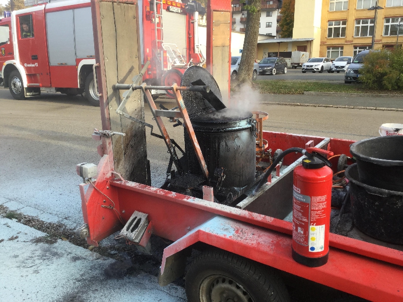 Auf einen Anhänger hat der Teerkocher gebrannt, die Arbeiter der Firma hatten bereits, mittels mehreren Handfeuerlöscher, das Feuer gelöscht. Wir übergaben die Einsatzstelle an die Polizei, da keine weiteren Maßnahmen für uns notwendig waren.